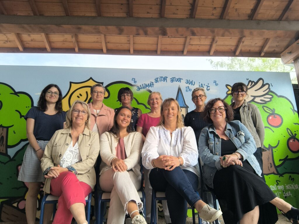 En haut : Camille DUCOS , Astrid DURAND , Christine FOREST , Patricia JANIN , Claire (AESH), NICKY